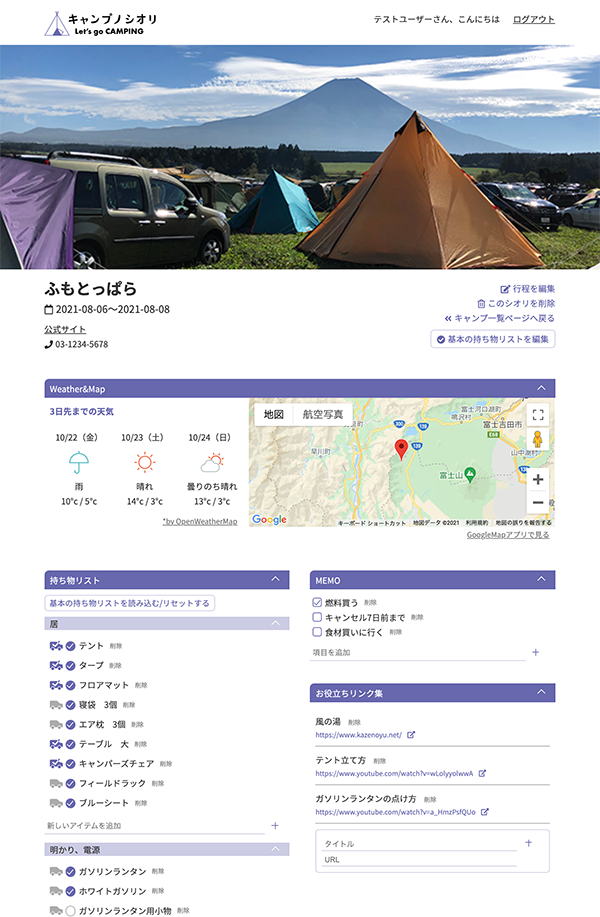 行く予定のキャンプ場を登録すると、天気予報・地図を表示します。